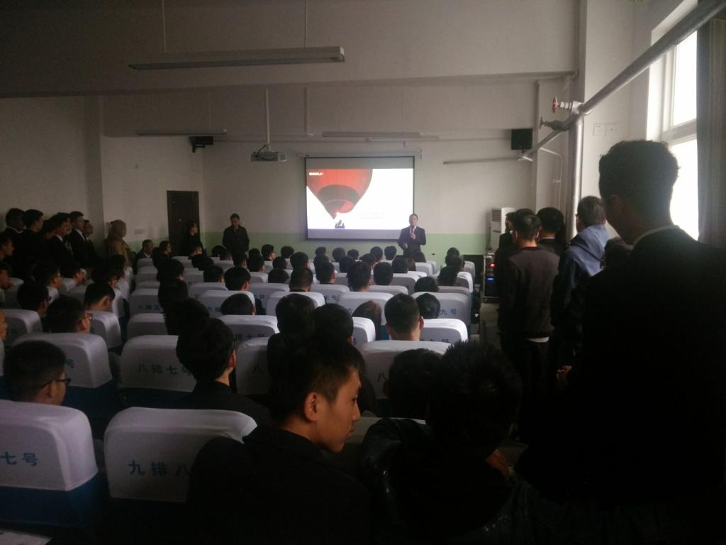 到会人员有吉利汽车成都公司人力资源副总监祝万云、beat365英国官网网站院长张耀虎、学生管理科科长罗伟、毕业班辅导员李扬以及报名参加“订单班”的同学和200余名应届毕业班的同学。首先吉利集团的招聘专员向大家讲解了吉利公司的发展现状、未来前景以及公司的配套设施、各个岗位的工资待遇与福利等,从自身就业说起,切合实际讲解了吉利公司的一系列的员工福利、制度,展示形式为PPT,公司宣传视频,使同学能更直观的了解吉利公司方方面面。