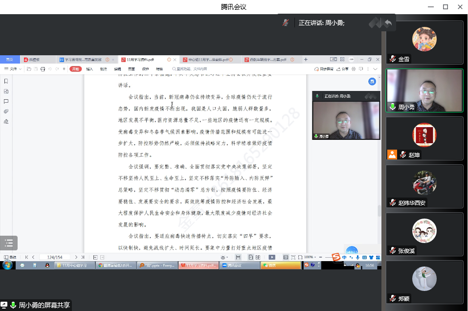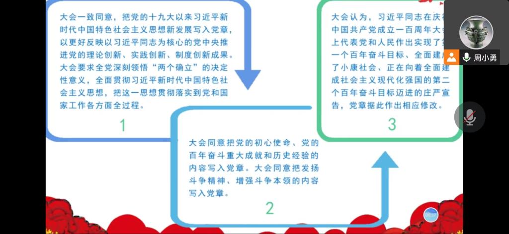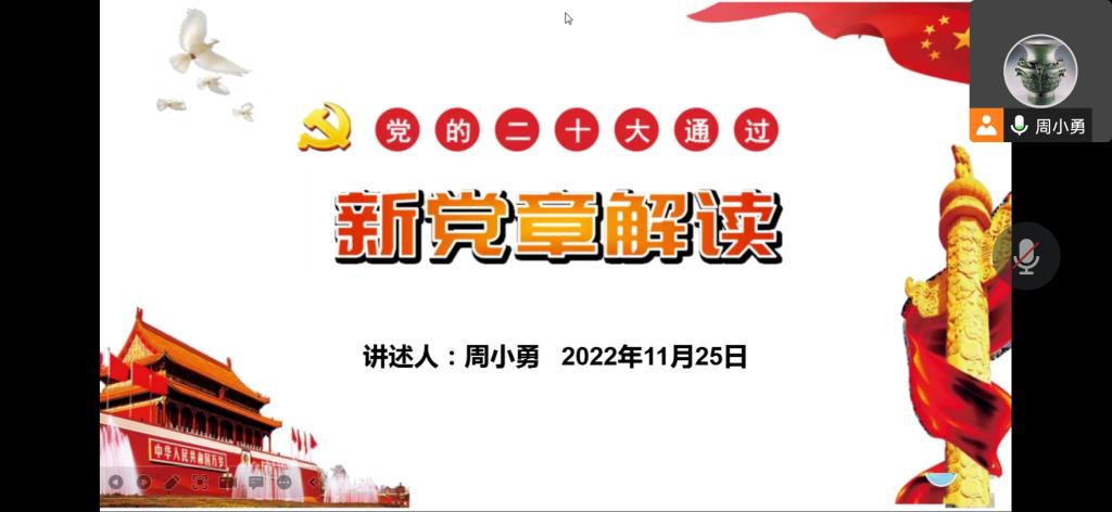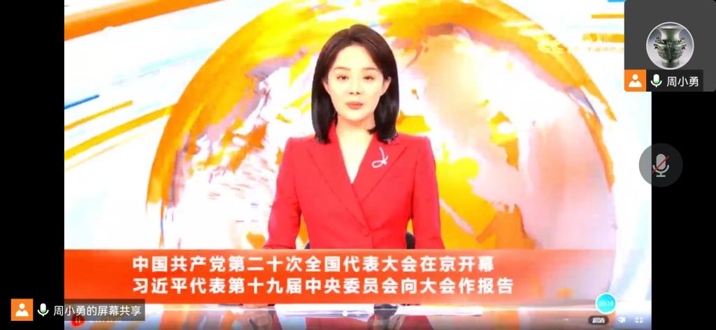 首先,全体与会成员共同观看了高举中国特色社会主义伟大旗帜为全面建设社会主义现代化国家而团结奋斗——在中国共产党第二十次全国代表大会上的报告视频。接着,周小勇领学《中国共产党章程(修正案)》,就“党章修订的历史背景”、“党章修改的主要内容”、“遵守党章的重要意义”展开学习。王兴路领学了习近平在中共中央政治局第一次集体学习时强调 全面学习把握落实党的二十大精神 奋力夺取全面建设社会主义现代化国家新胜利。赵坤领学了习近平在瞻仰延安革命纪念地时强调 弘扬伟大建党精神和延安精神 为实现党的二十大提出的目标任务而团结奋斗。于思月领学了中共中央政治局常务委员会召开会议 听取新冠肺炎疫情防控工作汇报 研究部署进一步优化防控工作的二十条措施 中共中央总书记习近平主持会议。刘雨辰领学了习近平给中国航空工业集团沈飞“罗阳青年突击队”队员们的回信。接下来,中心组成员一同学习了中国共产党第二十次全国代表大会在京闭幕习近平主持大会并发表重要讲话、习近平总书记在二十届中共中央政治局常委同中外记者见面时的讲话精神、习近平总书记在参加党的二十大广西代表团讨论时强调心往一处想劲往一处使推动中华民族伟大复兴号巨轮乘风破浪扬帆远航、十九届中央纪律检查委员会向中国共产党第二十次全国代表大会的工作报告。最后,周小勇、王鑫结合近期的学习分享了学习心得。