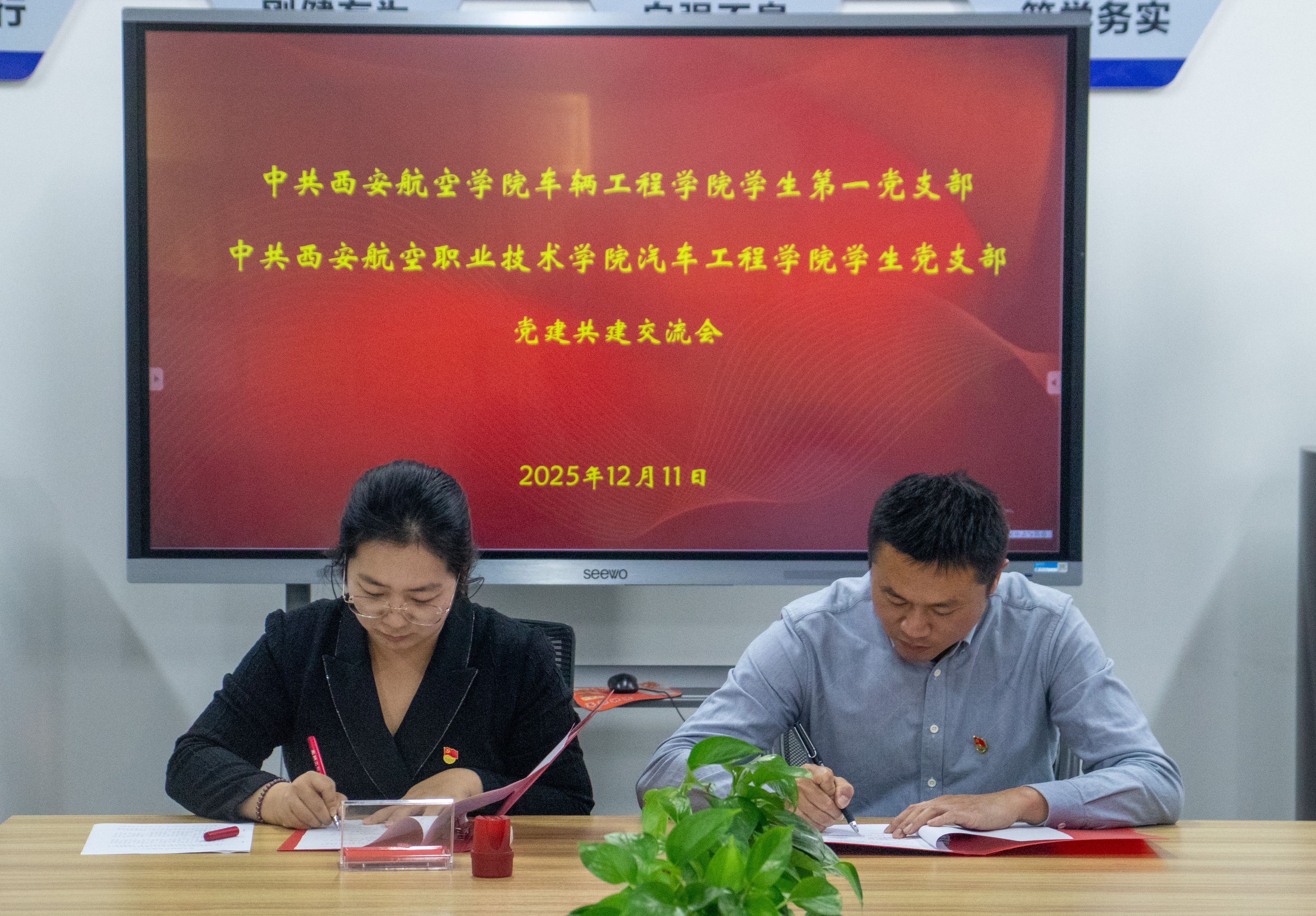 随后,双方学生党支部书记共同签署《党支部结对共建协议书》,明确了共建目标、共建内容及保障机制。根据协议,双方将充分发挥学校航空特色优势,在航空科普知识宣传、汽车文化艺术等方面开展交流活动,推动党建工作与学科专业发展、学生成长成才深度融合。