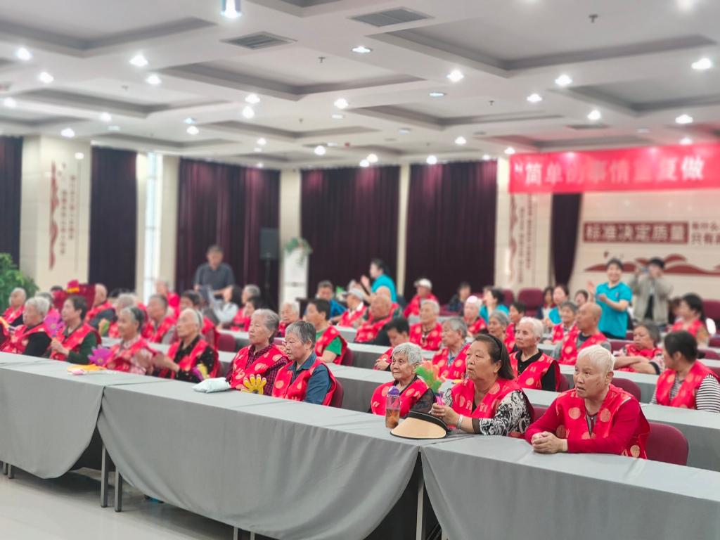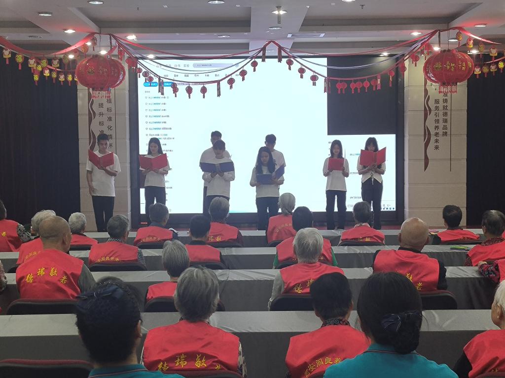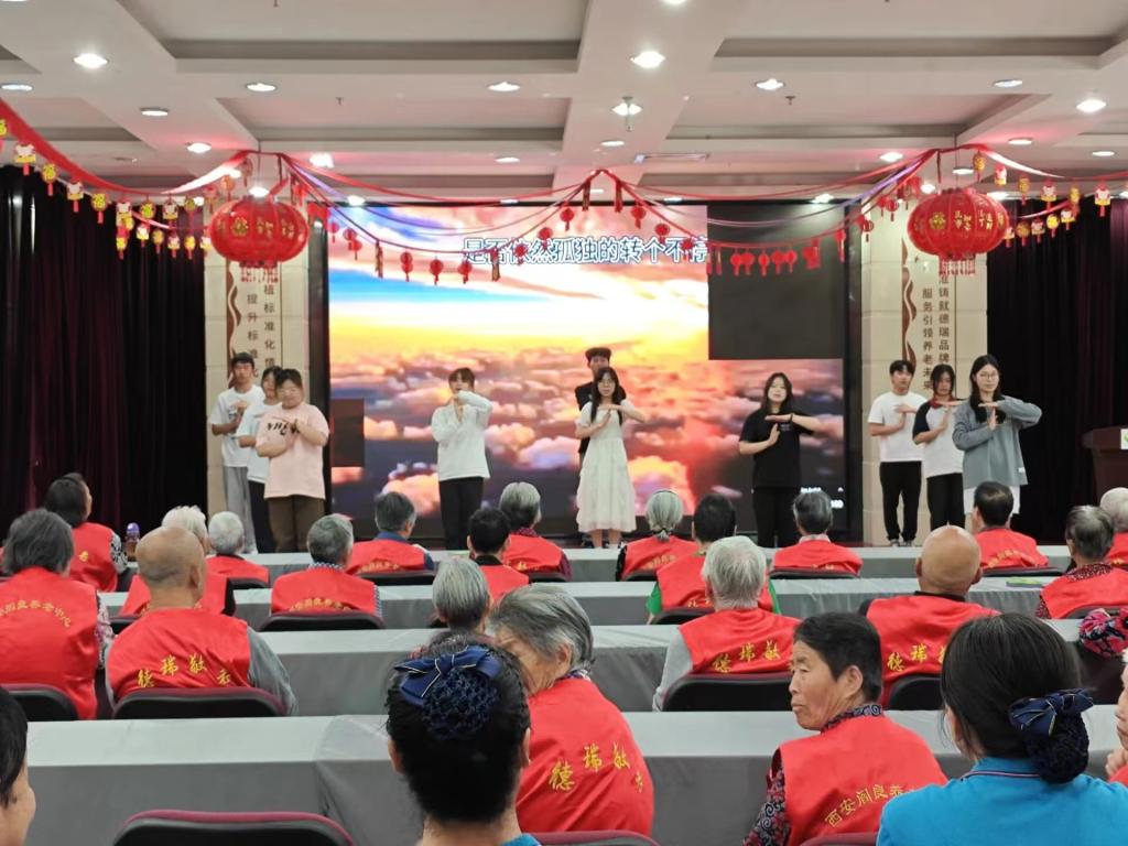 党员志愿者中队联合学院文艺部精心准备了丰富多彩的文艺演出,为老人们带去欢乐和笑声。歌曲《童年》、朗诵《母亲是一种岁月》、手语操《相信明天会更好》、歌曲《萱草花》,赢得了全场观众的掌声,老人们个个脸上洋溢着幸福的笑容。表演结束后,志愿者和工作人员将精心准备鲜花、小礼品一一送到老人手中。
