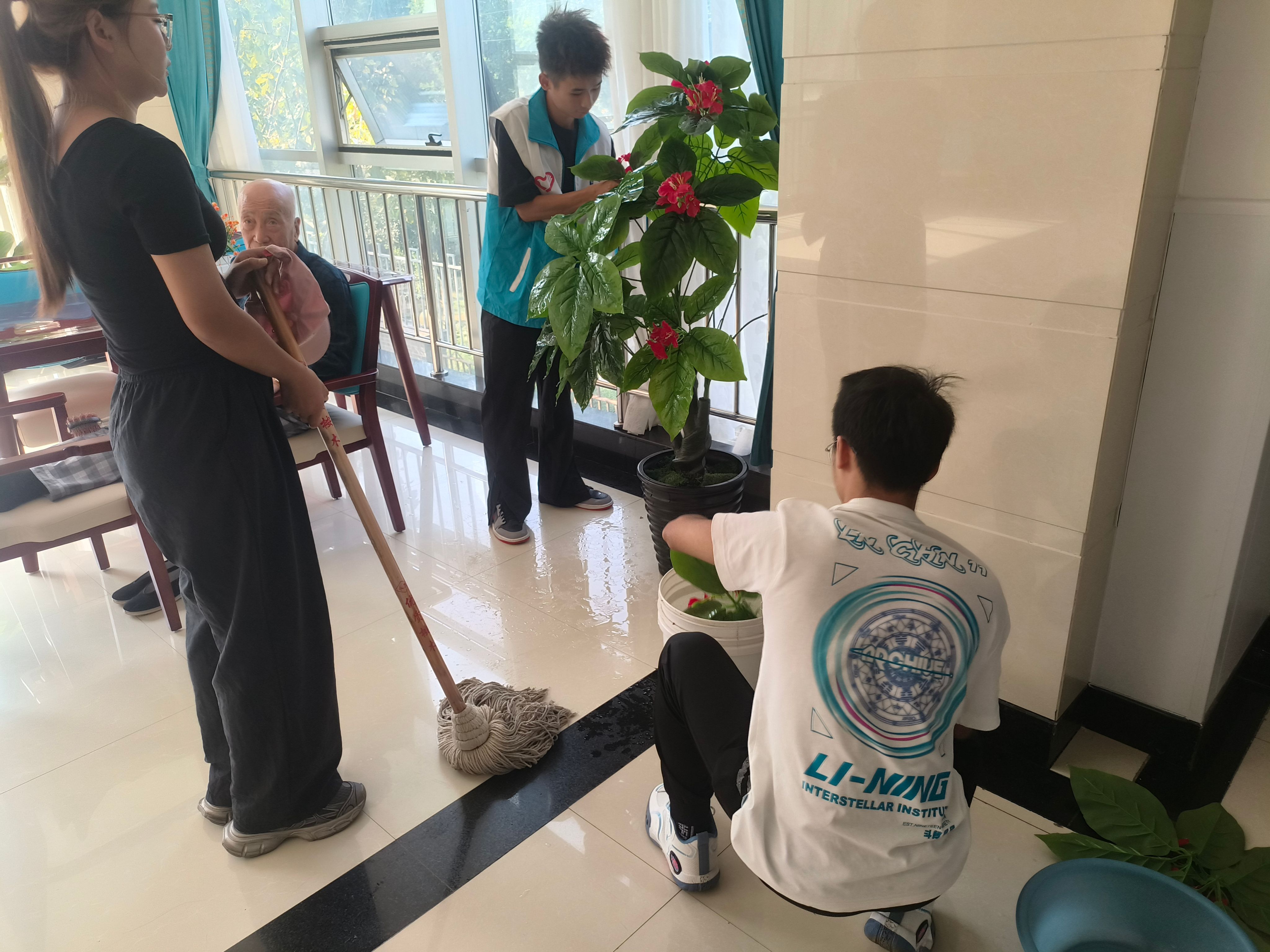在这阳光明媚的日子里,33名志愿者在养老院工作人员的悉心指导下,积极参与到活动厅、会议室、院落的清洁打扫工作中。他们与老人们亲切交谈,分享笑话,传授养生小知识,倾听他们的故事,用青春的热情为老人们带去了如阳光般温暖的关怀。