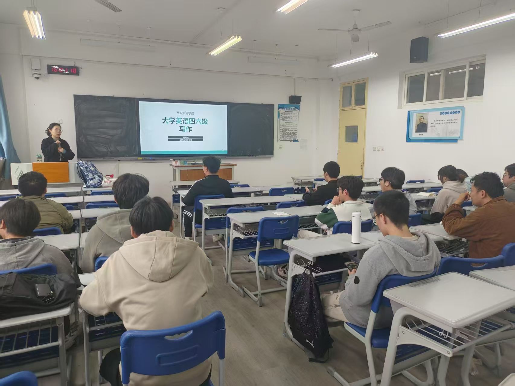 胡月琦博士聚焦英语四六级考试的写作提分技巧,系统讲解了议论文和应用文的备考策略。针对议论文写作,胡老师重点讲解了现象解释类、观点选择类和问体解决类等高频题型,并通过真题、范文逐一分析高分文章的写作框架;应用文部分则选取推荐信、投诉信、邀请信等4种常见考型,归纳了"开头-主体-结尾"的标准结构。现场气氛热烈,学生踊跃参与。