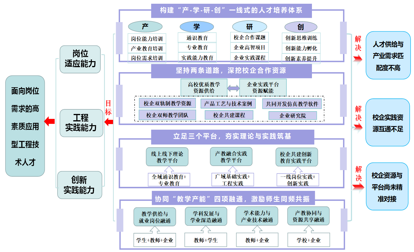 该人才培养体系以适应职业岗位需求的应用型人才为主线,以高校优质教学资源供给、企业平台实践资源赋能为两大路径,基于线上线下理论教学平台、产教融合实践平台、合作共建创新教育平台,扎实筑牢学生理论与实践基础。通过协同推进“教学产能”四个对接,即教学供给与就业岗位融通、学科发展与学业深造融通、教师学术能力与产业技术融通、产教协同与资源共享融通,激发师生的积极性与创造力,实现同频共振,形成了一套独具特色且行之有效的人才培养体系。