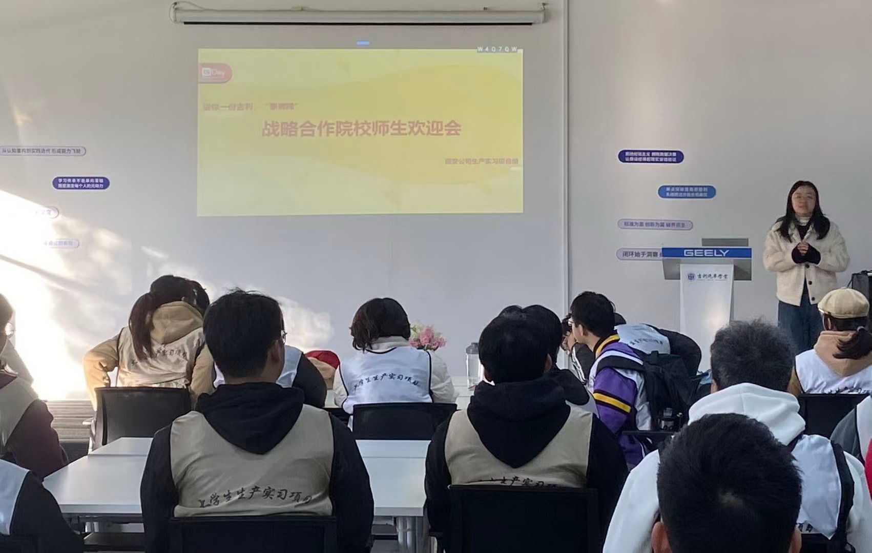 实习开始,西安吉利汽车有限公司人力资源部举行了热情洋溢的战略合作院校实习师生欢迎会。通过公司发展历史介绍,同学们深刻感受到吉利汽车伴随中国汽车制造业奋斗、崛起的艰辛发展历程,懂得了努力与坚持的可贵。