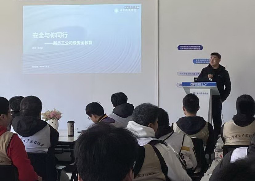 为确保实习活动安全、有序进行,吉利西安基地安全工程师杜鹏为全体实习学生进行了公司级安全培训。培训内容结合汽车制造现场实际,详细讲解了厂区安全规范、设备操作注意事项、个人防护用品穿戴要求及应急处理流程。